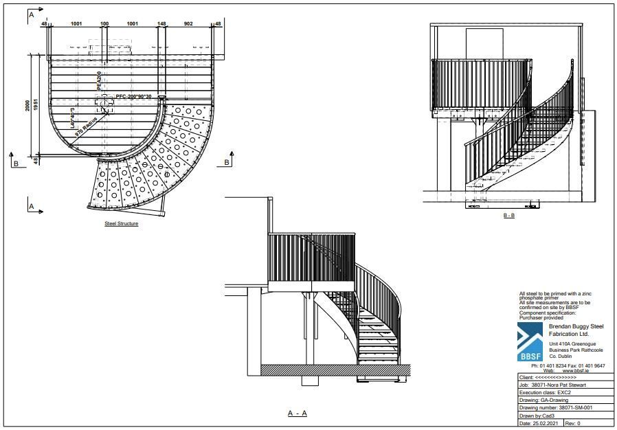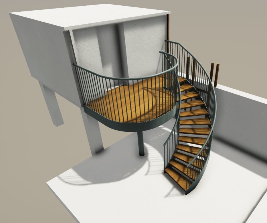 Balcony and helical staircase installed into garden with access from first floor of a private house. BBSF designed and fabricated the project to modular specification to allow as little disruption as possible. The project included removal of existing structure, ground works, mild steel galvanised frame, powder coated finish, composite decking floor and steps.